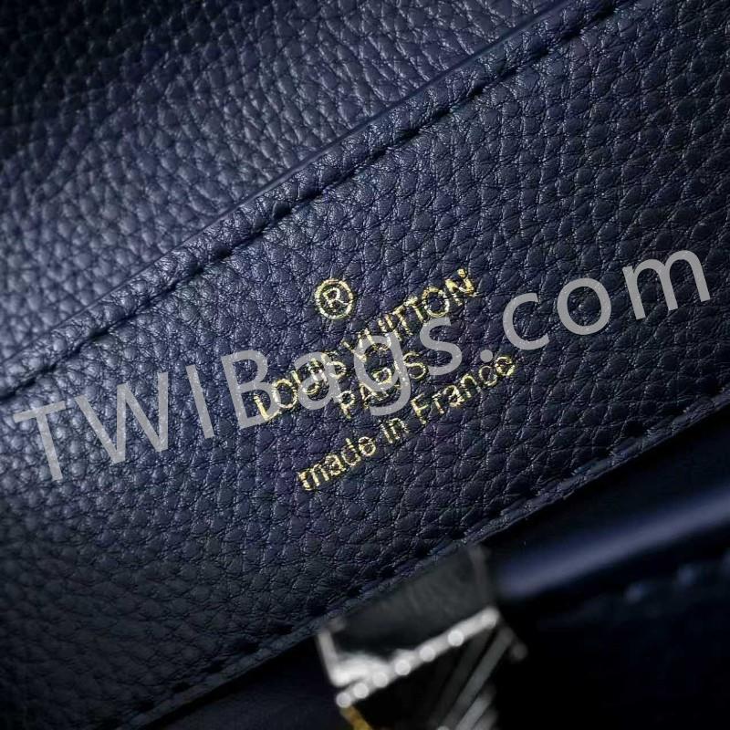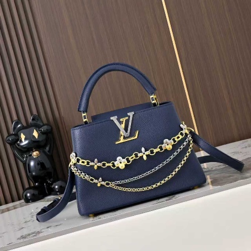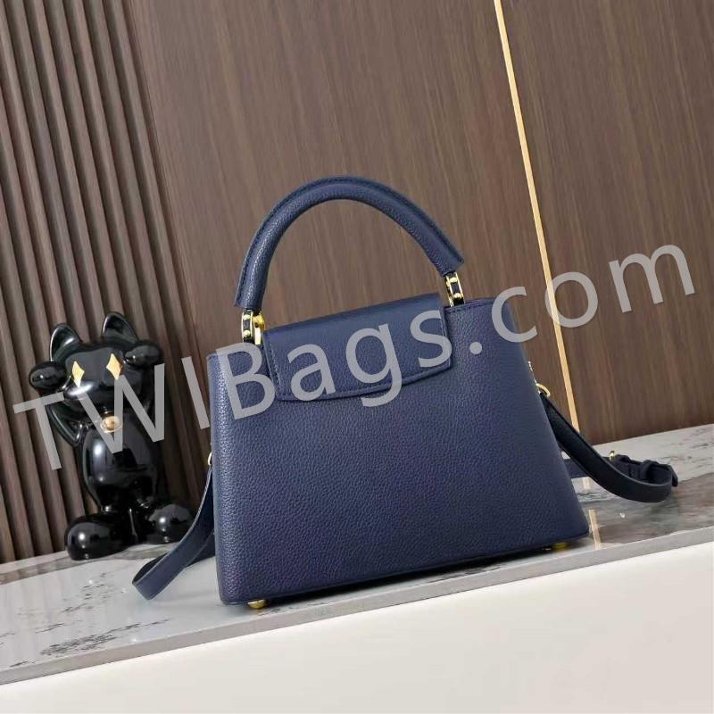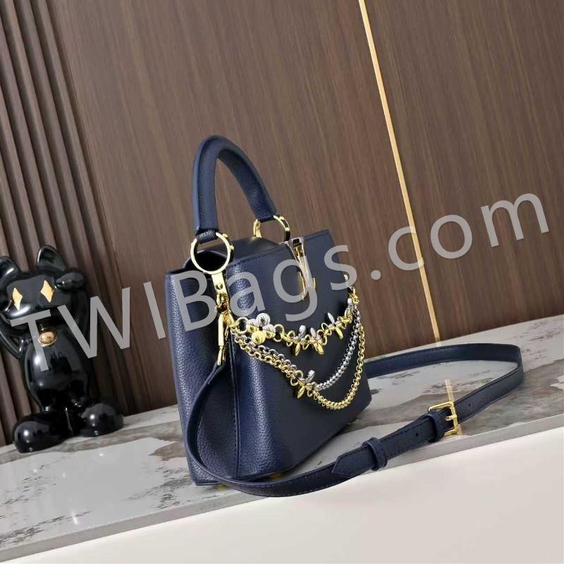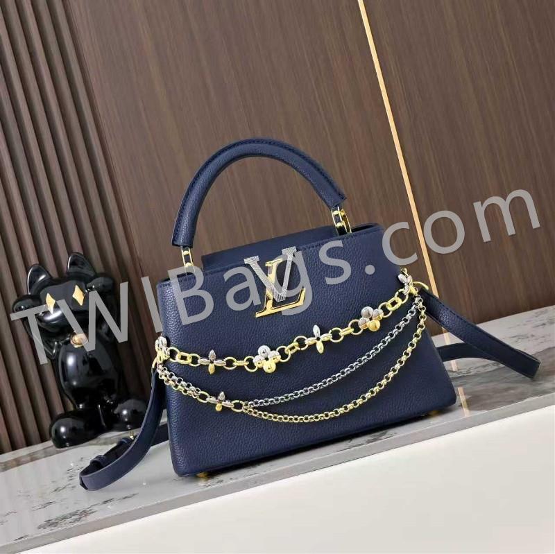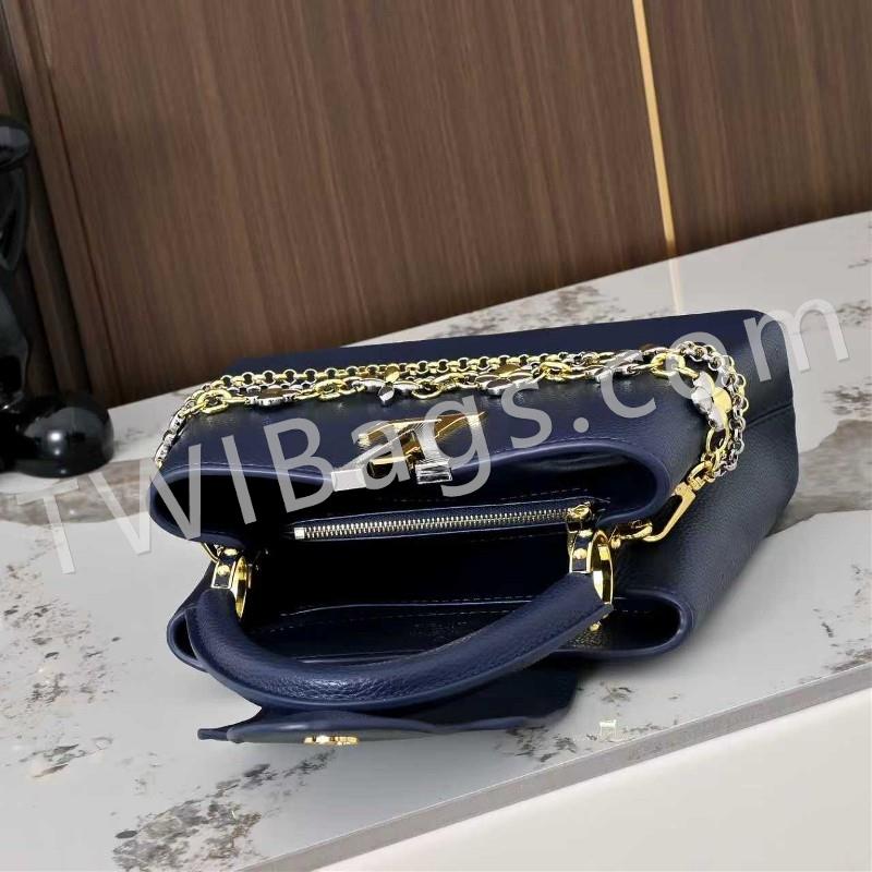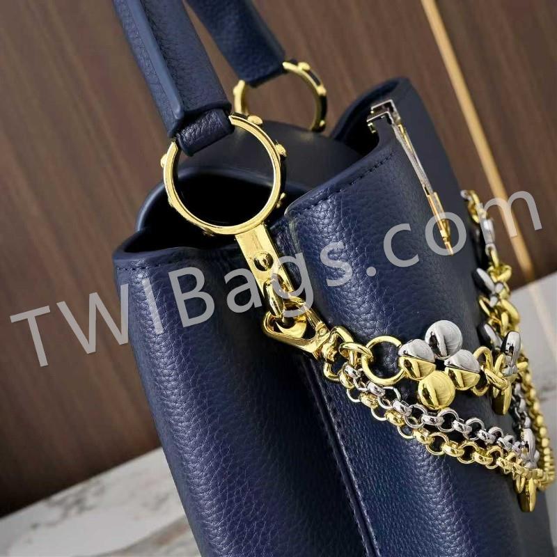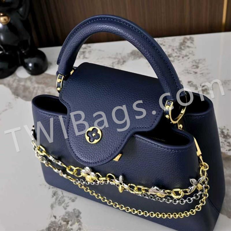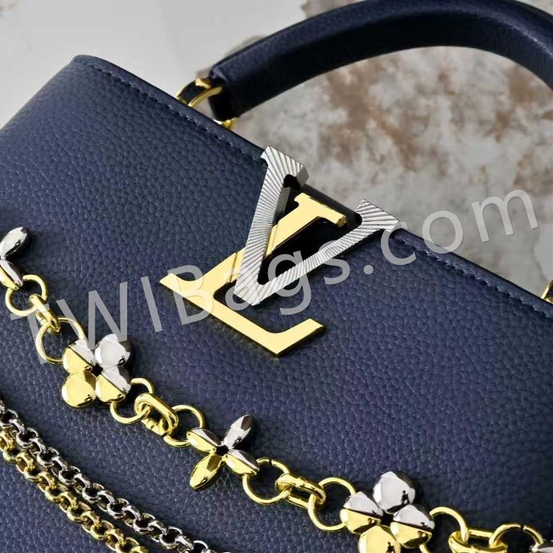 M26532 Blue This modern version of the Capucines BB is crafted from timeless Taurillon leather and features a jewel-inspired Infinity chain. The bag is adorned with double galvanized metal parts, including the iconic Monogram floral motif and the LV Intials logo created by the sunburst process, creating a sundial-like light and shadow effect. The bag has multiple pockets and a detachable shoulder strap, allowing you to carry it over the shoulder or crossbody. 27 x 17.3 x 9 (cm) (L x H x W)