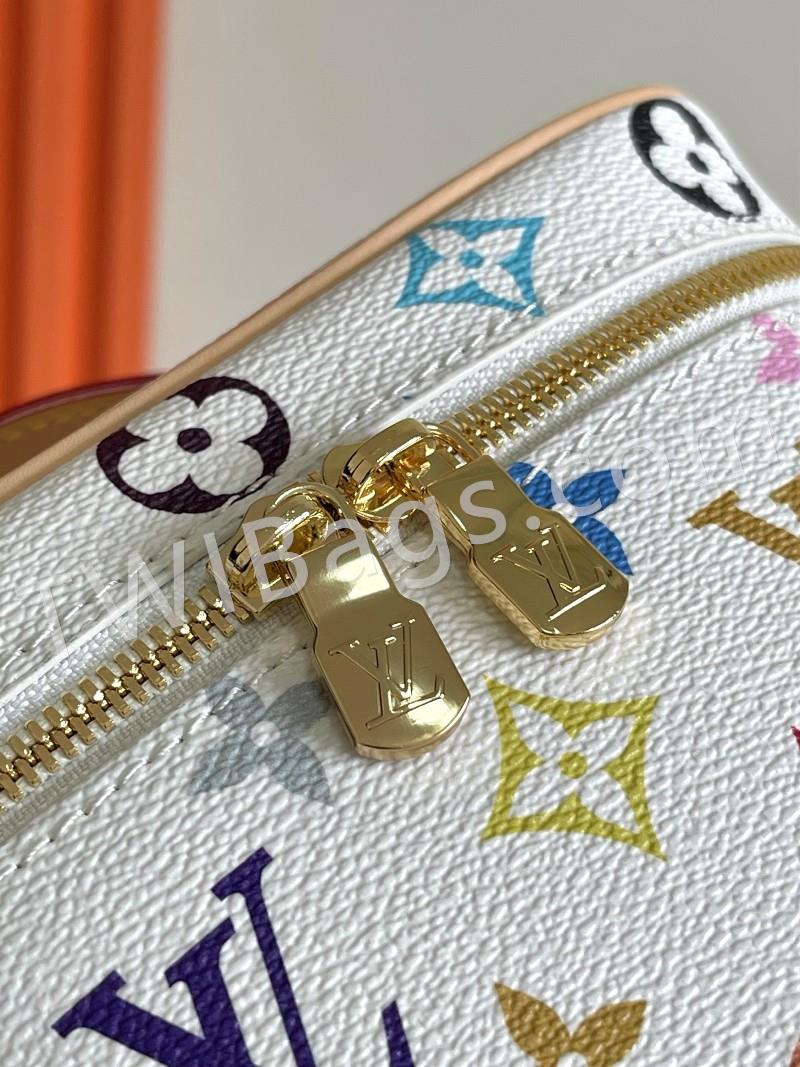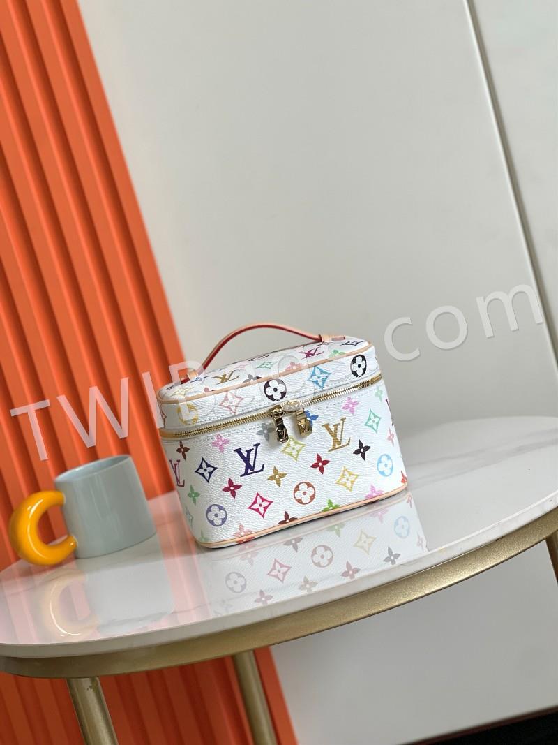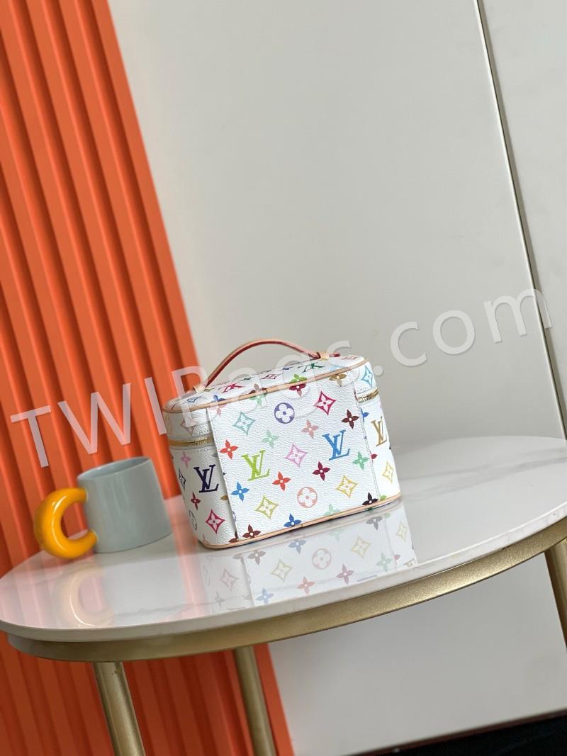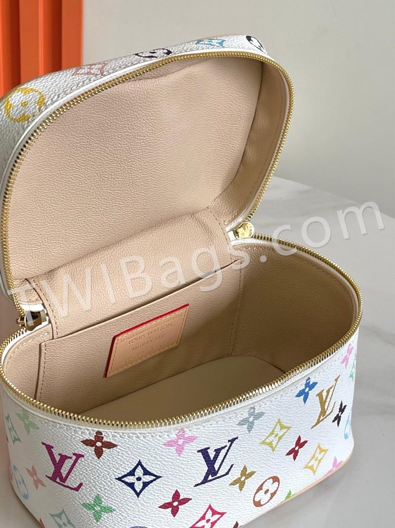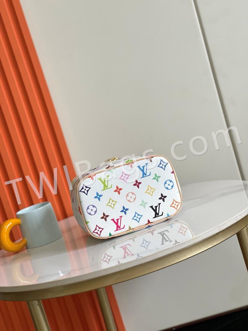M13747 black and white This Nice Nano makeup bag from the Louis Vuitton x Murakami reissue collection uses colorful Monogram-coated canvas to create a delicate configuration, and in 2025, Japanese artist Takashi Murakami's agile style cleverly reinterprets the brand's classic elements. Top with leather handle and double zipper closure, washable fabric lining Extra function element 20x 13.5 x 12 cm (L x H x W )
